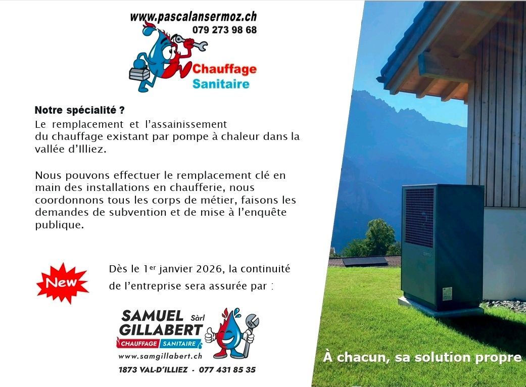 Au bénéfice d'un CFC en Chauffage-Sanitaire, il travaille avec une équipe de 5 collaborateurs donc Rénald Gillabert - Florian Avanthay et Samuel Gillabert avec brevet fédéral et fournit un travail de qualité pour des produits haut de gamme, elle vous garantit un travail sérieux et suivis donc l'objectif principal est votre satisfaction